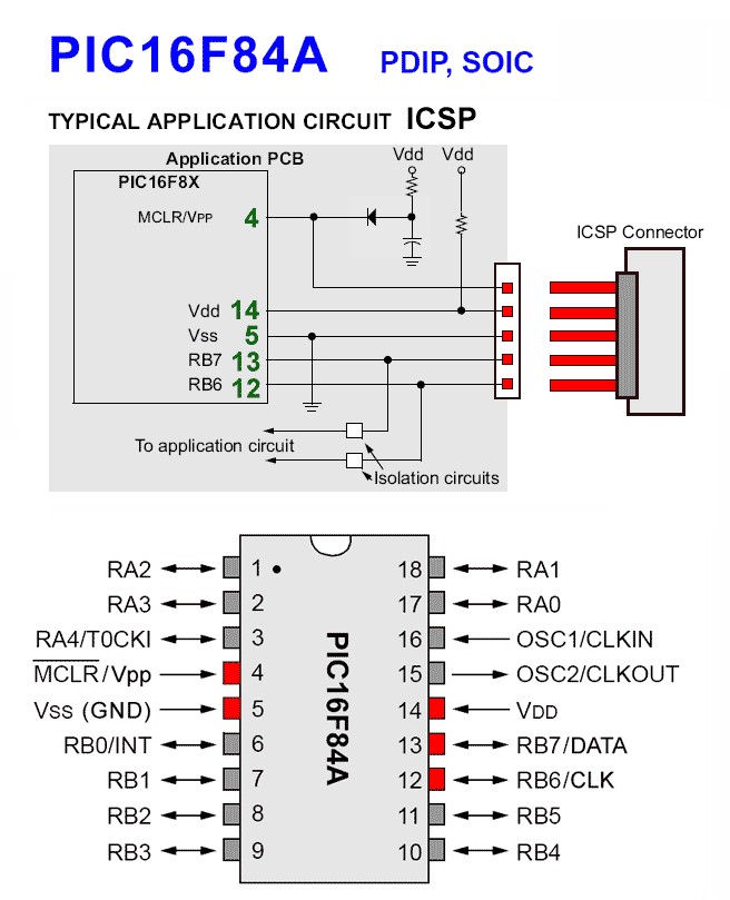 نکته:نحوه اتصال پروگرامر به میکرو طبق شکل است.اما چون ما توسط نرم افزار MPLAB گزینه VDD یا همون تغذیه میکرو را فعال میکنیم نیازی به ولتاژ ۵ ولت خارجی نیست